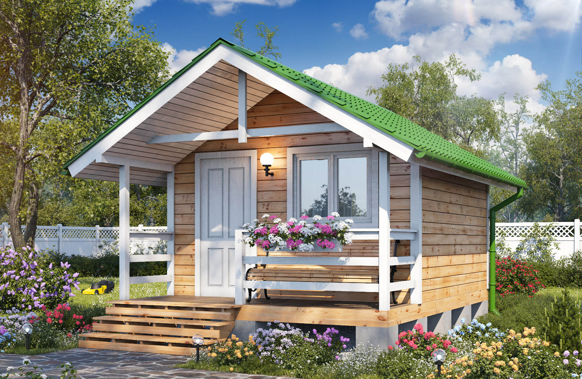 1 этап — фундамент, возведение каркаса под кровлю, окна, входная дверь 2 этап — внутренняя отделка |