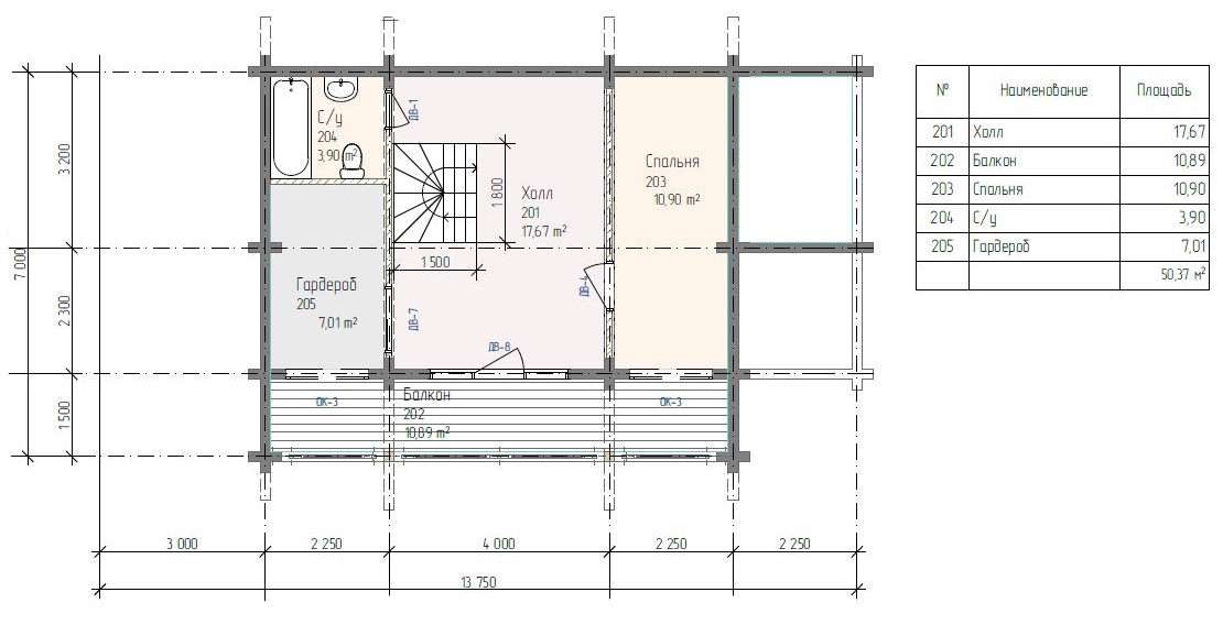 — Перекрытие между первым и вторым этажами: Доска камерной сушки, 50х200 мм. |