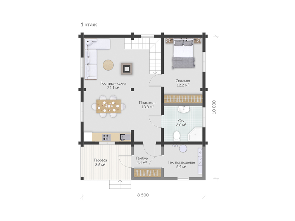 Входная дверь — металлическая, с терморазрывом Лестница — по проекту, с ограждениями |