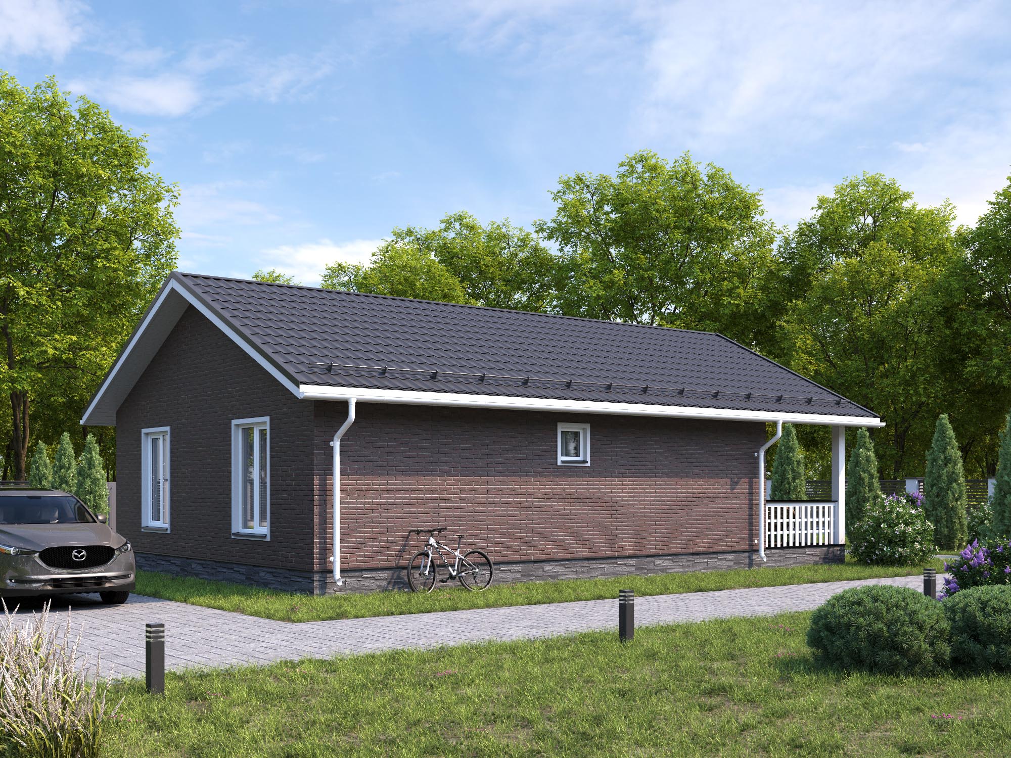 -Наружная отделка – Хауберг (отделка под кирпич) или Рау-хаус (имитация бруса) -Теплоизоляция – 150мм. -Внутренняя отделка стен, перегородок – ГКЛВ |