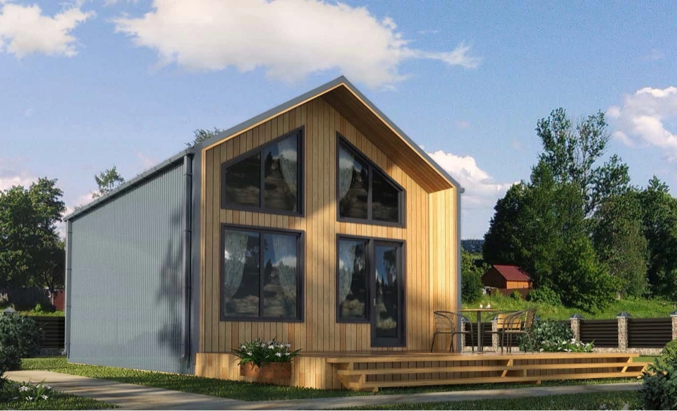 -Вентиляционный зазор -Наружная отделка – Крашеный профнастил + Рау-Хаус (имитация бруса) -Теплоизоляция 1 и 2 эт. – 100 мм. -Гидро-ветроизоляция -Внутренняя отделка (стены 1 и 2 эт.) – Вагонка |