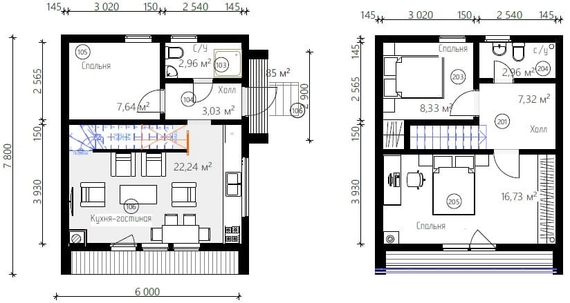 -Внутренняя отделка (потолки 1 и 2 эт.) – Вагонка -Теплоизоляция пола 1 эт. – 100 мм. |