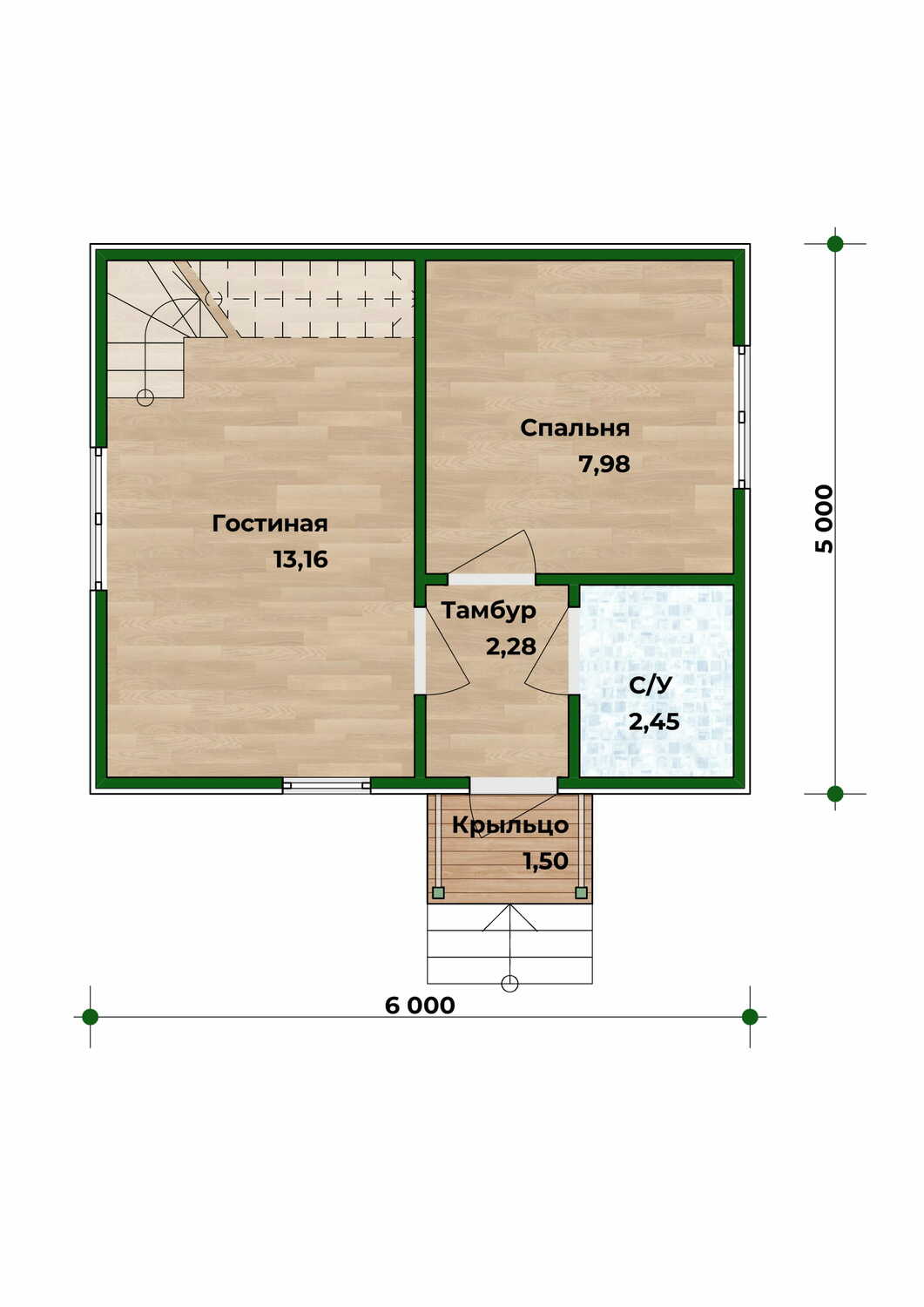 1 этап — фундамент, возведение каркаса под кровлю, окна, входная дверь 2 этап — внутренняя отделка |