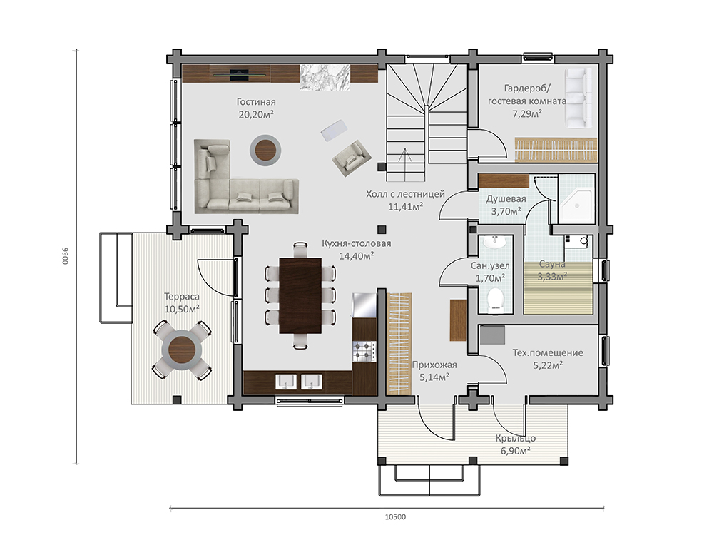 Входная дверь — металлическая, с терморазрывом Лестница — по проекту, с ограждениями |