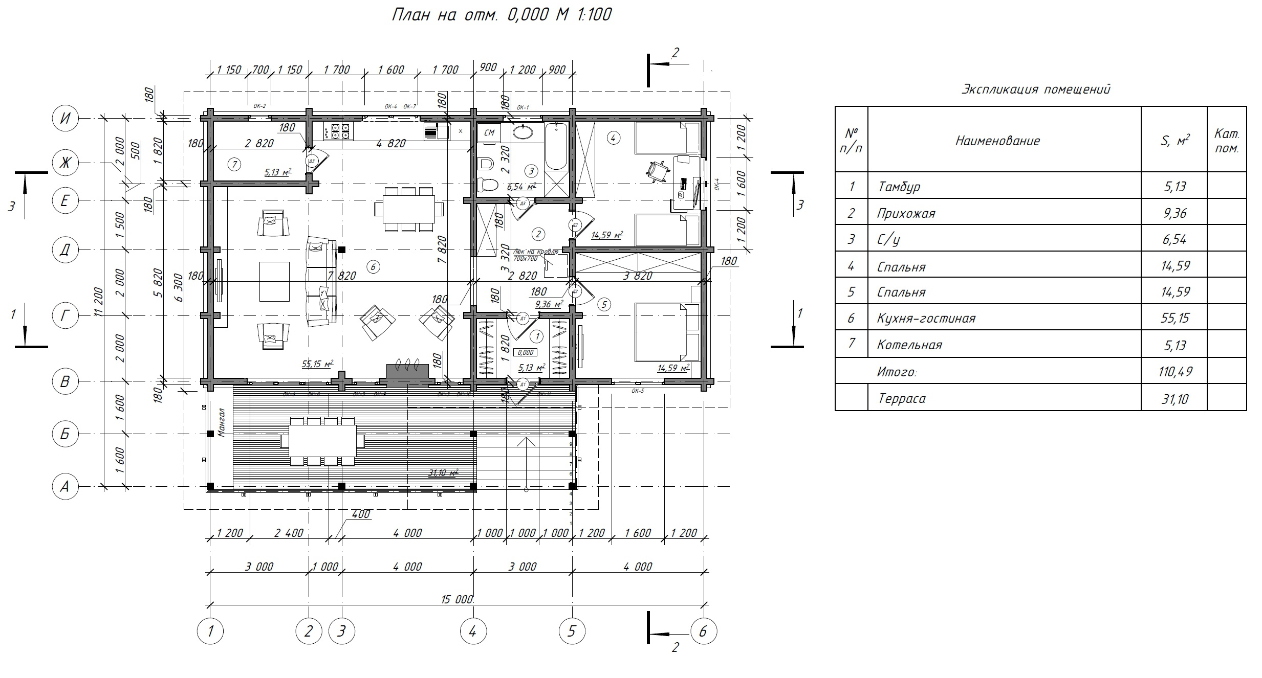 | Технология | Проект может быть исполнен из клееного бруса и профилированного бруса камерной сушки. |