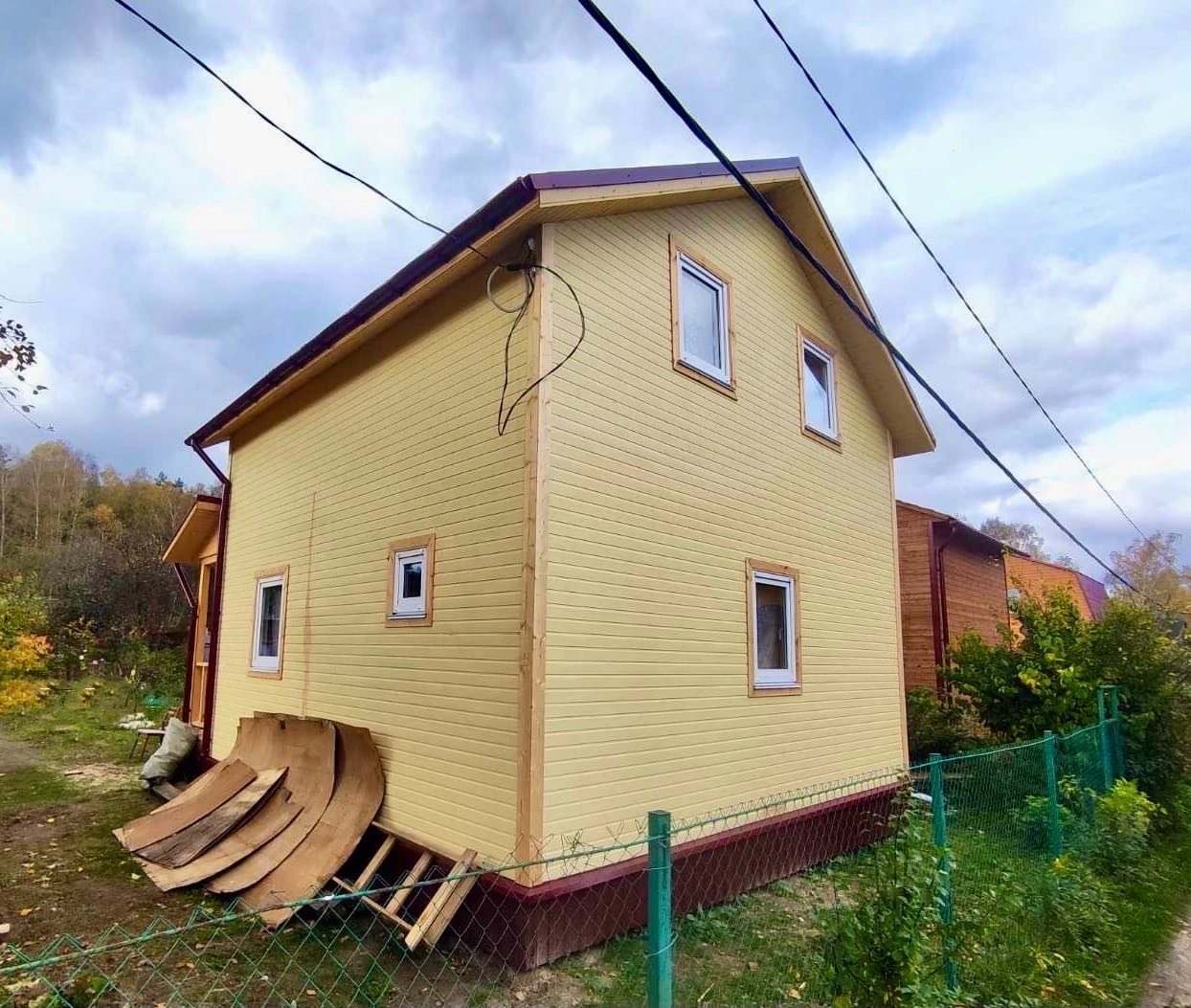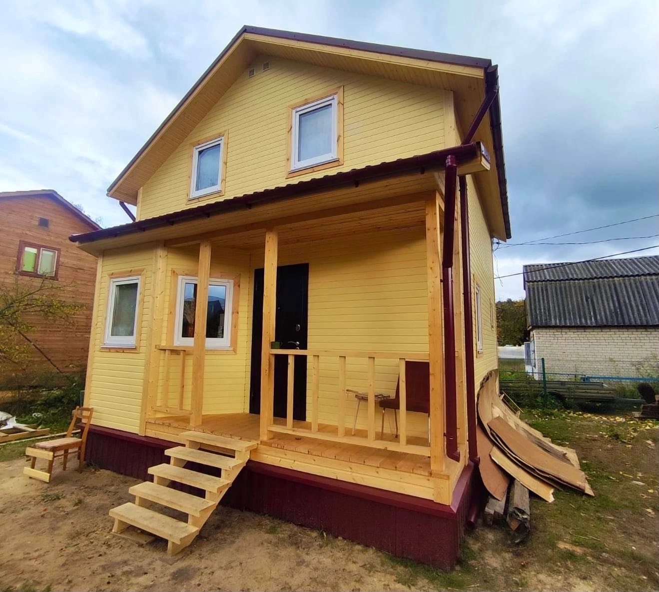 1 этап — фундамент, возведение каркаса под кровлю, окна, входная дверь 2 этап — внутренняя отделка |